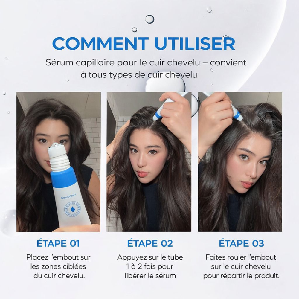 Appliquez quelques gouttes directement sur le cuir chevelu sur cheveux secs ou légèrement humides. Massez doucement pour activer la circulation et favoriser la pénétration des actifs. Ne pas rincer et utilisez quotidiennement pour des résultats optimaux.